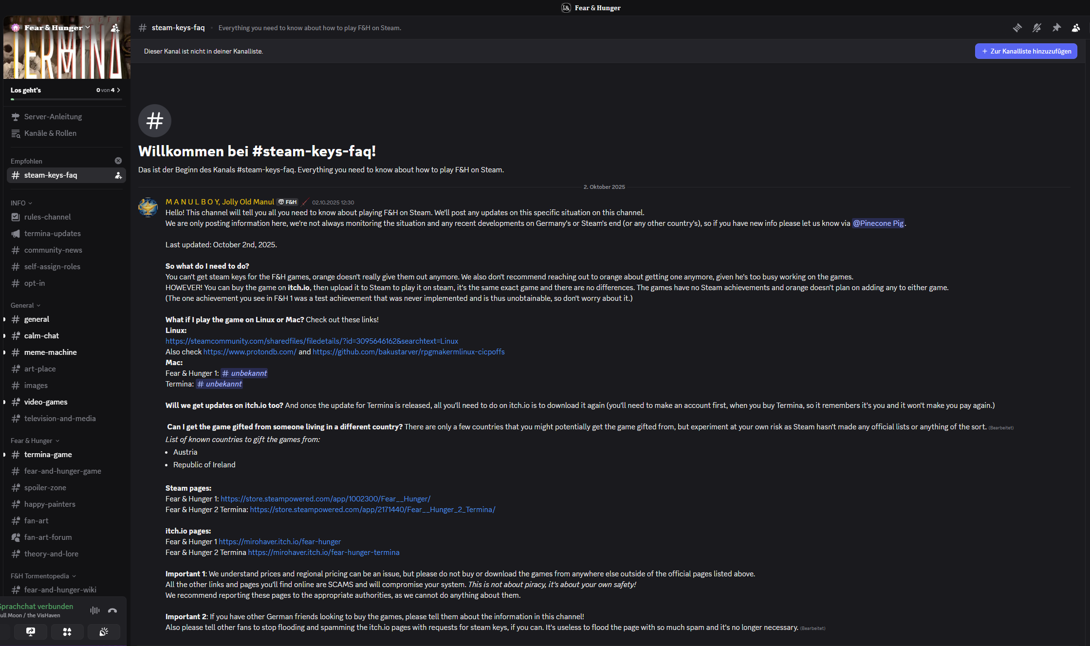 I would like to request a Steam Key for Fear and Hunger Termina. Im from Germany and i sadly am not able to buy it on steam. Thats why im asking you kindly to give me a steam key so i can have this masterpiece in my libary.