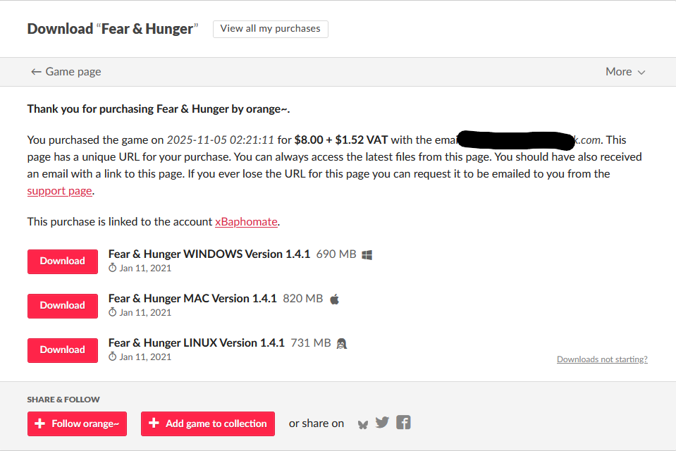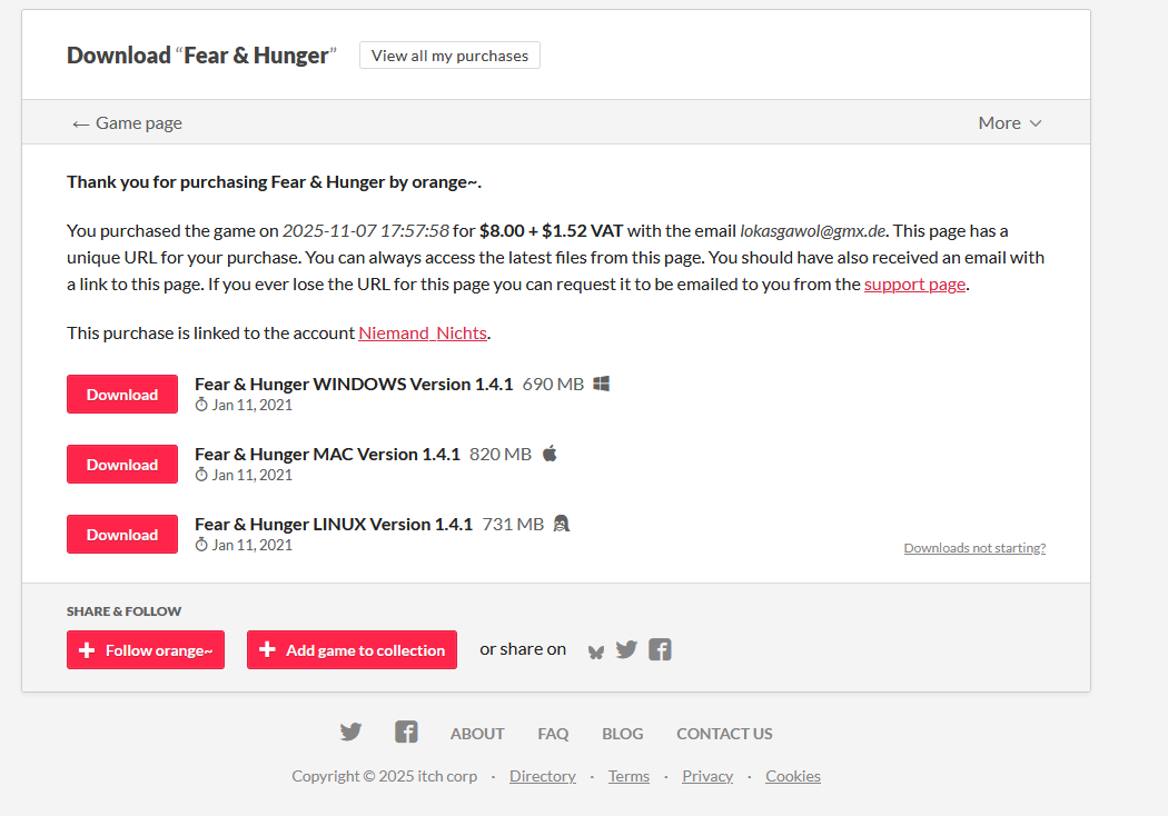 Hello mate, also from germany here. bought the game and would love a key for steam since you cant get it in germany. will also happily bought fear and hunger if everythings works fine <3